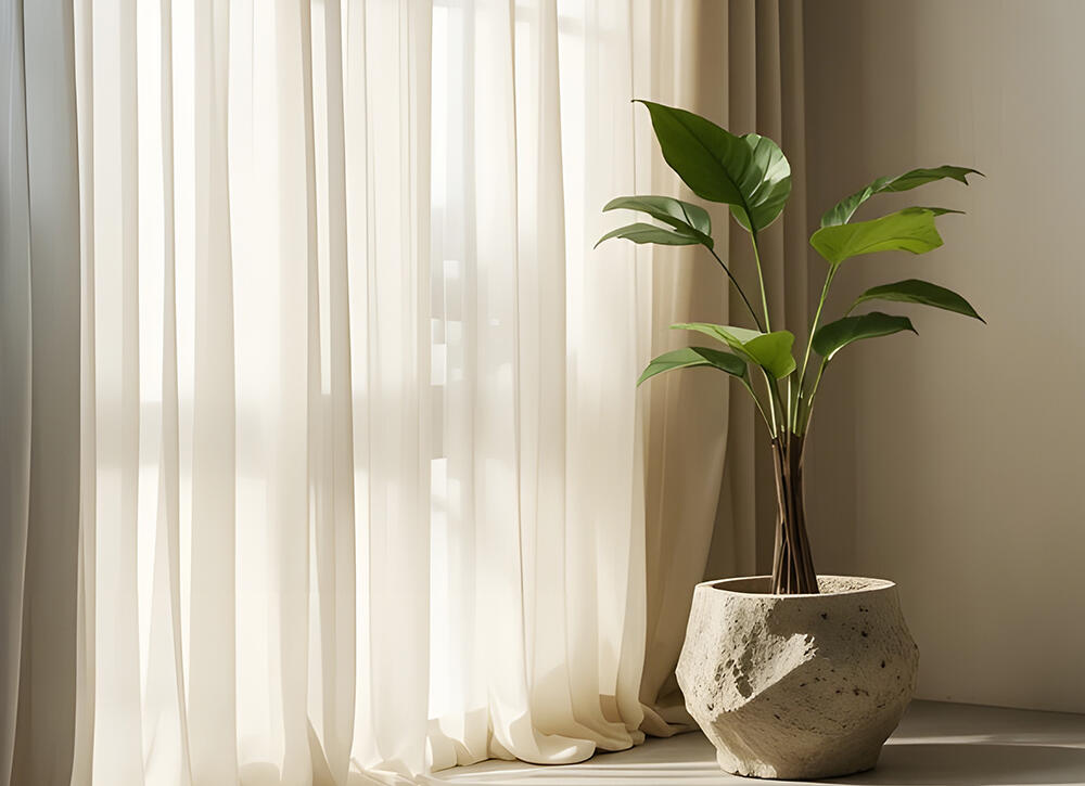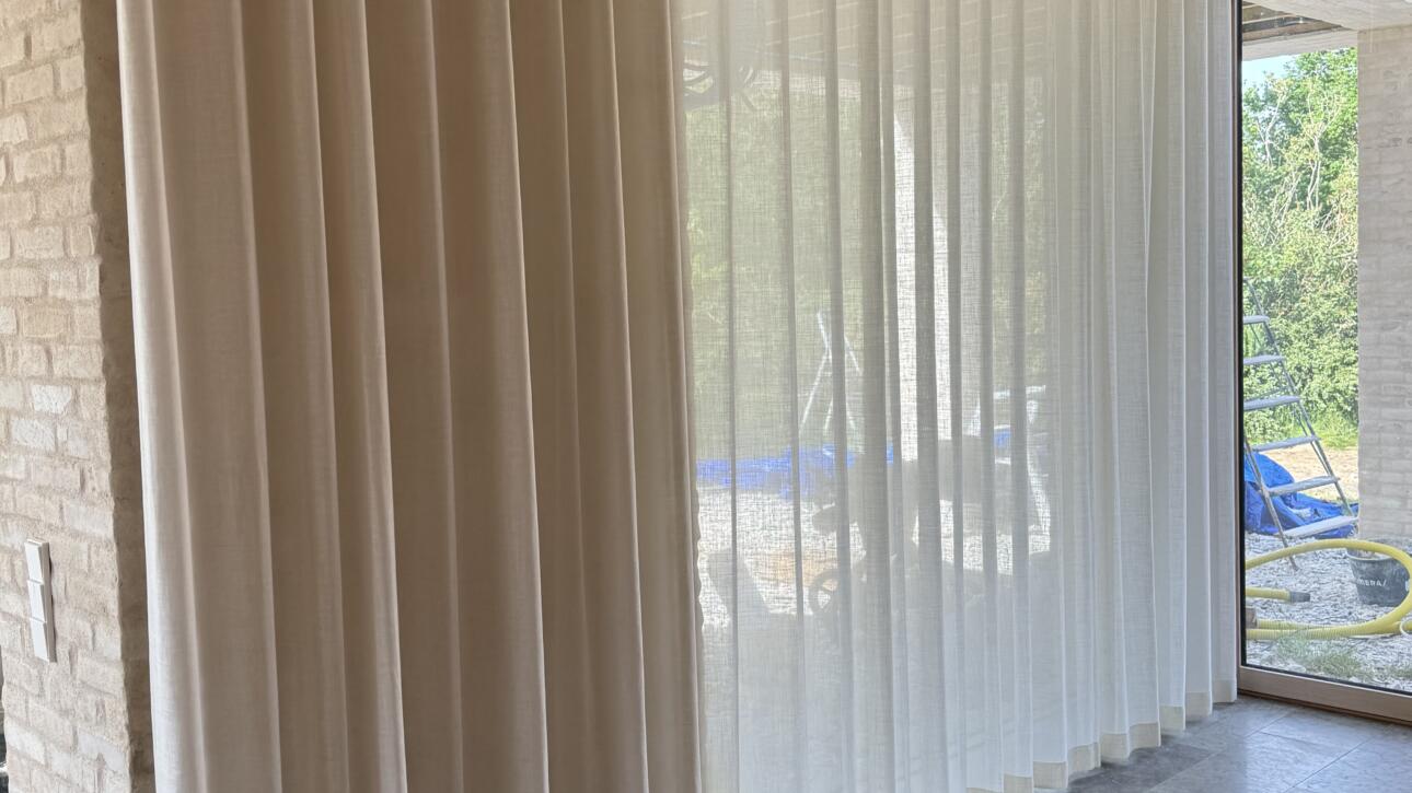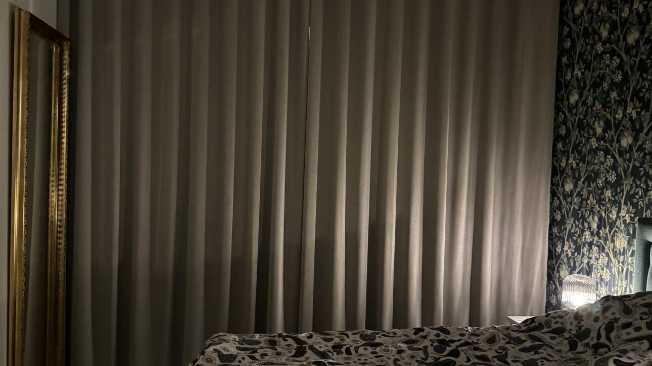 Utgå från neutrala, varma toner som bas och lägg till accentgardiner i blått eller dämpade mönster för att ge rummet personlighet.